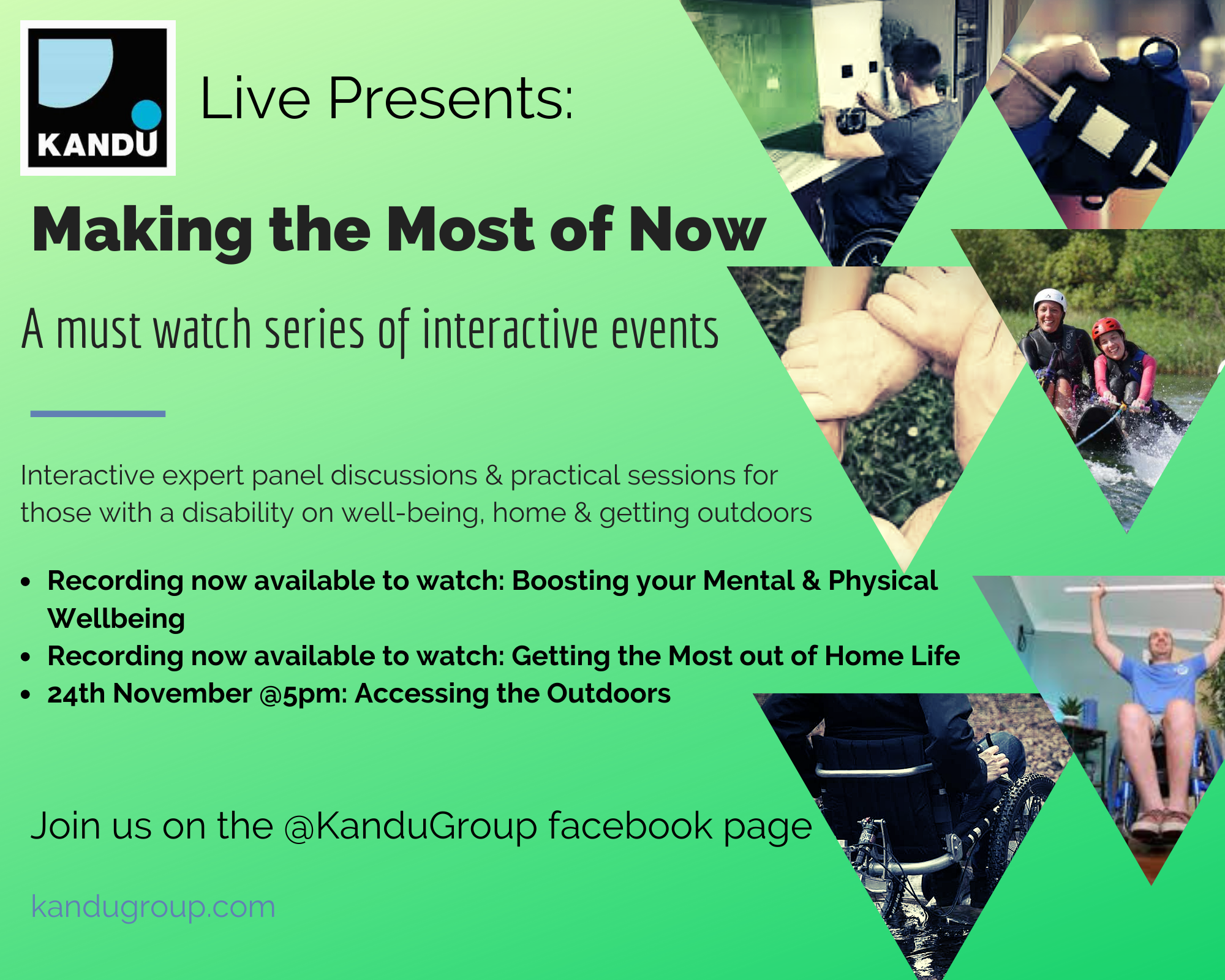Watch event 3 promotional video for an idea of what to expect from the event: Kandu Group Live event, Accessing the Outdoors #3