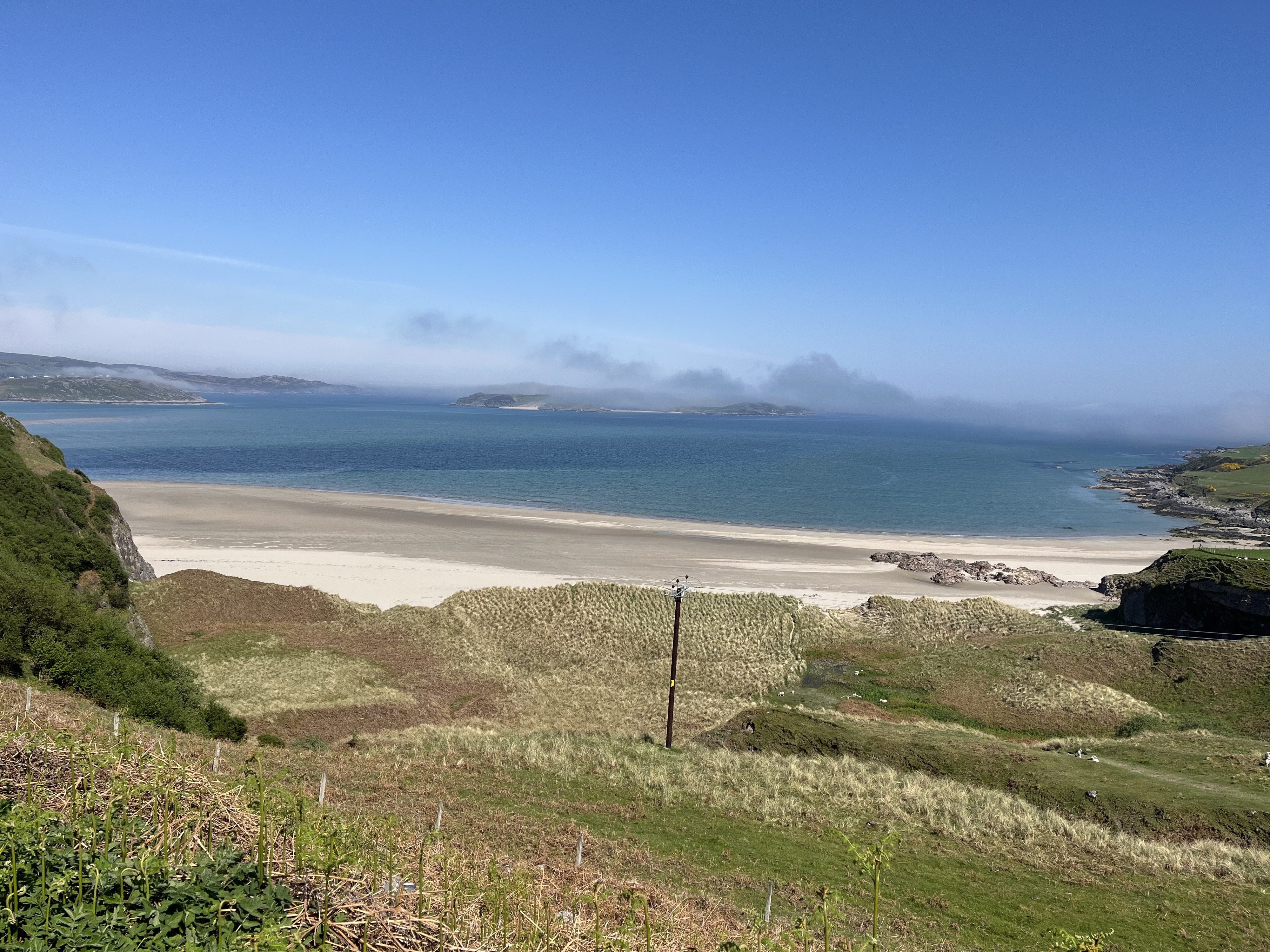 Day 9 and Day 6 NC500. Another beautiful start to the day as we left Melvich with a long drive ahead of us. We started with another look at Melvich and its beach access, then moved on. Our first stop was at Bettyhill viewpoint and Tourist Information cafe with sight of the mountains to come. Next stop was Coldbackie with some stunning views. We crossed The Kyle of Tongue and travelled on to Loch Eribol and more amazing views stopping just outside Durness for lunch and admiring views of Ceannabeinne Beach and The Kyle of Durness. Moving inland and south the mountains started to grow on our horizon and a fog rolling in was chasing us. Made a brief stop at Rhiconich then on to our destination Scourie Guesthouse in Scourie. Dinner was booked down a steep single track road to Tarbet at The Shorehouse Seafood Restaurant and granted Bill’s wish for Scottish Langoustines!