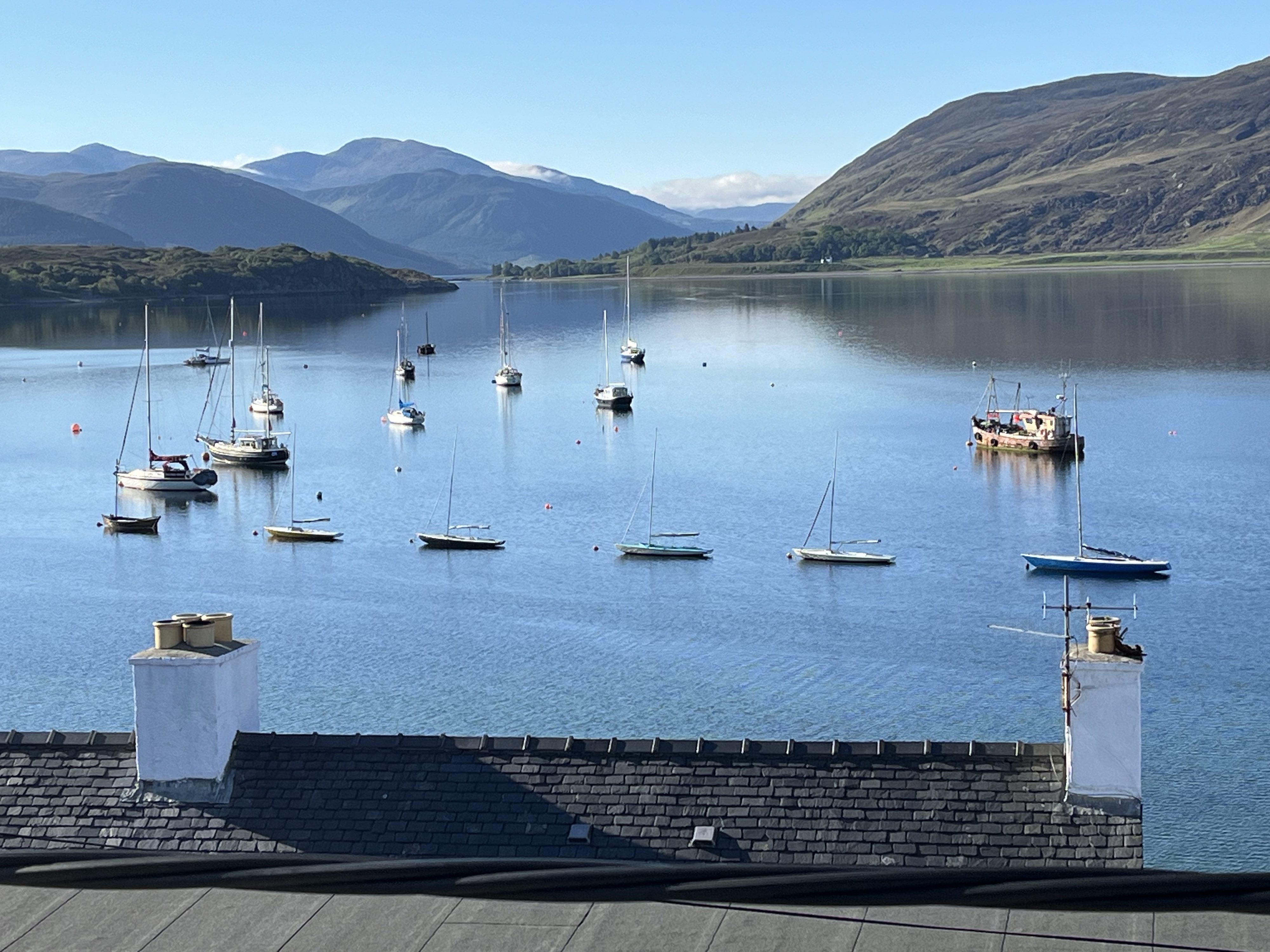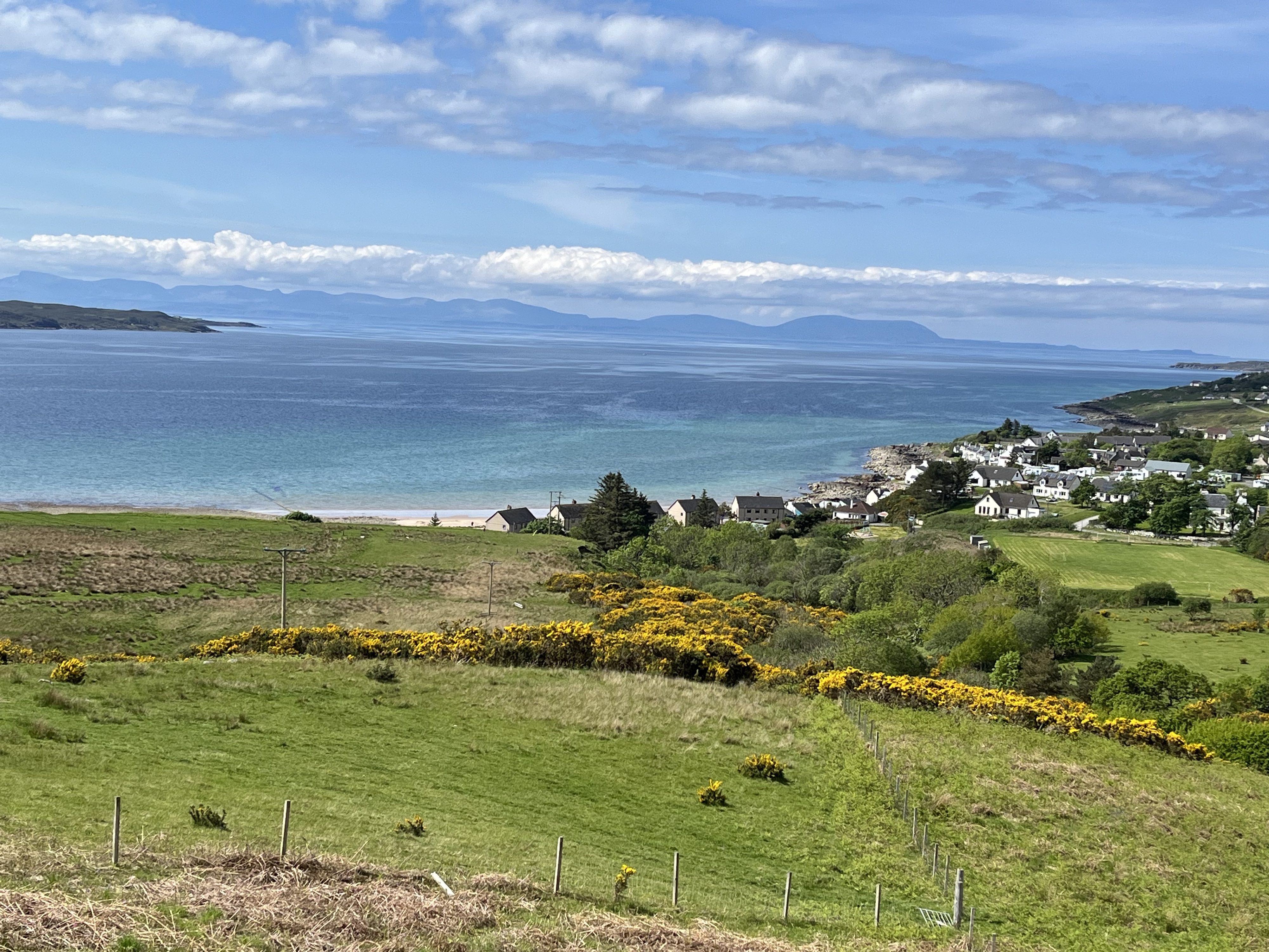 Day 12 and Day 9 of NC500. Woke up to a gorgeous view of Loch Broom in the early morning sun and had to take a few more pictures before we left. Stopping at Ardcharnich for the view along Loch Broom and Dundonnell on Little Loch Broom we came to Gruinard again looking much prettier in the sun. Moved on to Laide then stopped for lunch at Inverewe Gardens at Poolewe. Sadly we didn’t feel we could look round the gardens this time as we still had a long way to go. Moved on to Gairloch then Loch Maree with sight of Slioch, and stopping for a break at Beinn Eighe Visitor Centre. Moving on past Kinlochewe the mountains were getting bigger and we still had a lot of driving on this coastal road to reach our destination. We stopped briefly at Torridon for a trip down memory lane but didn’t have time to go to the deer centre. Our final pause was at Shieldaig then we pushed on to Applecross. Finally arrived in Applecross just in time for dinner at the Applecross Inn after some stunning views of the mountains and an interesting drive on the coast road. Went for a stroll in the evening admiring the views across to The isles of Rona, Raasay and Skye and a gorgeous sunset. We were really taken with this pretty little village and its stunning views and really wished we had booked more than one night at the Inn.