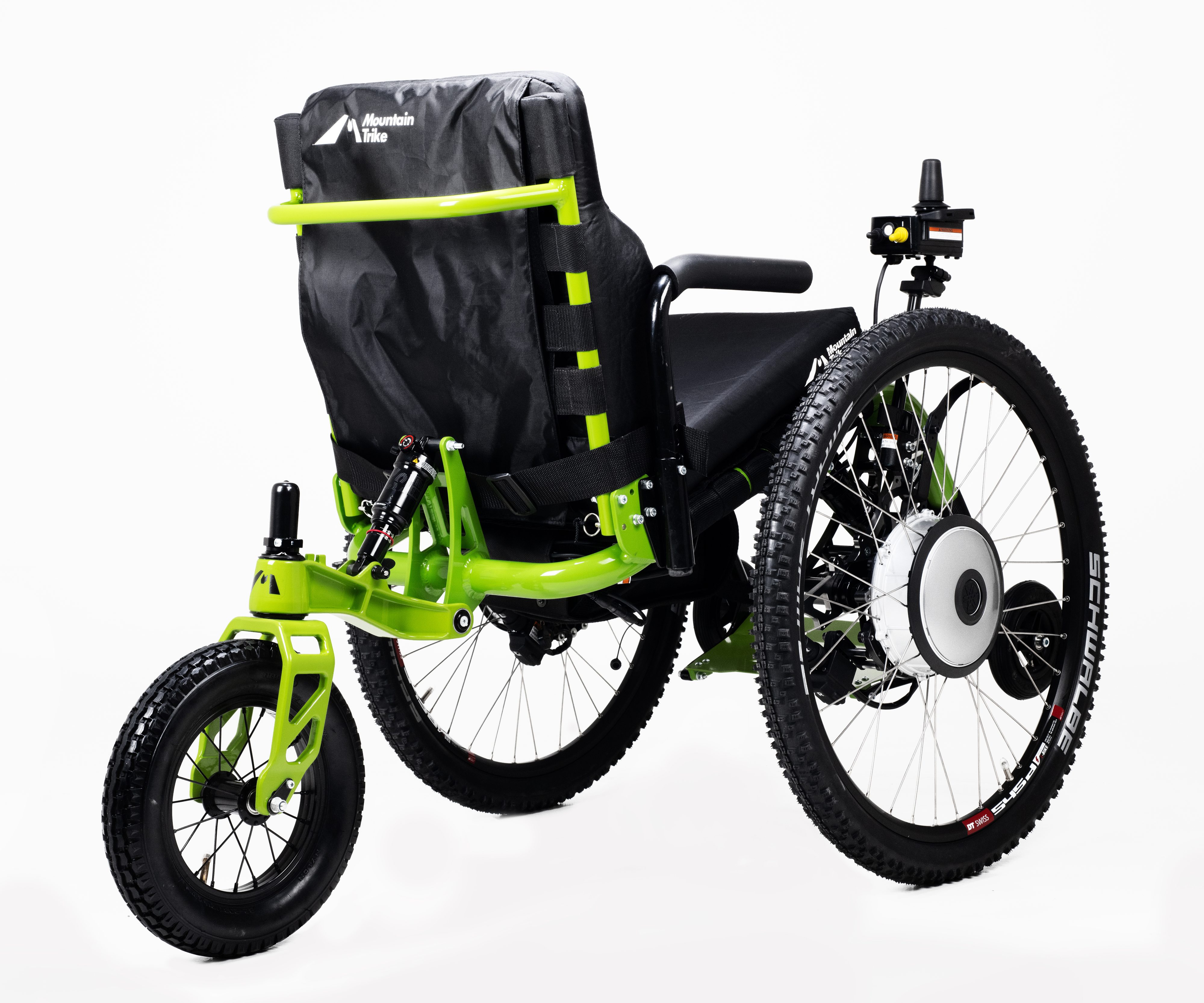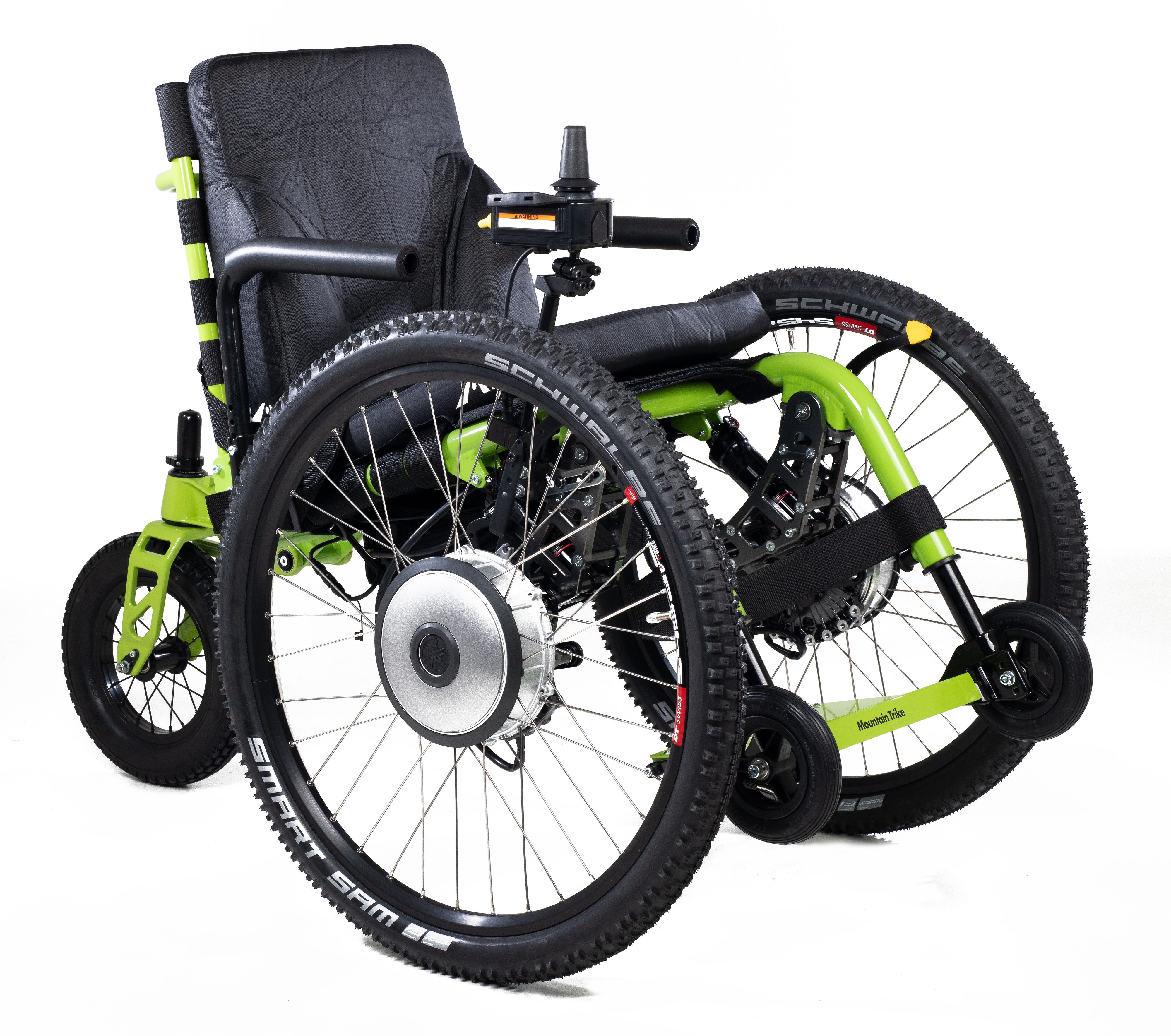 Using the same components to those found on the Mountain Trike means there is no compromise to the terrains the adapted joystick driven Mountain Trike will be able to travel over - uneven ground, gravel, grass, mud, sand, snow. And with the SD Motion system it means that the rider can power on with confidence using the simple and easy to use joystick.